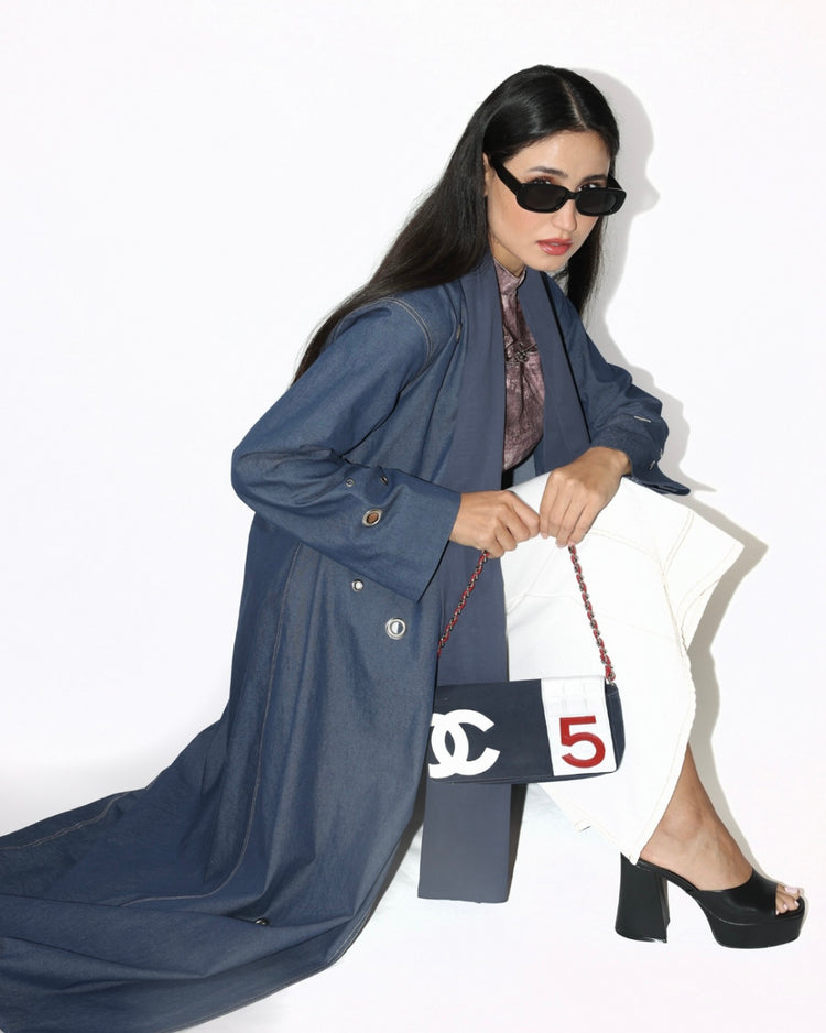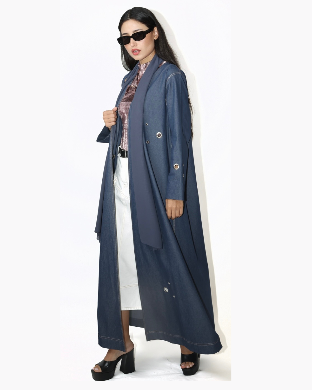 Light weight denim abaya studded with metal eyelets